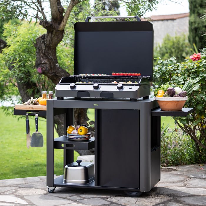 De Achille-trolley is een eigentijds meubelstuk met strakke lijnen. Dankzij de hoogwaardige afwerking past het perfect in elke ruimte, zowel binnen als buiten. Gemaakt van hoogwaardige materialen , waaronder gegalvaniseerd staal , biedt het een stevige structuur die een grote plancha kan dragen zonder dat dit ten koste gaat van de stabiliteit.