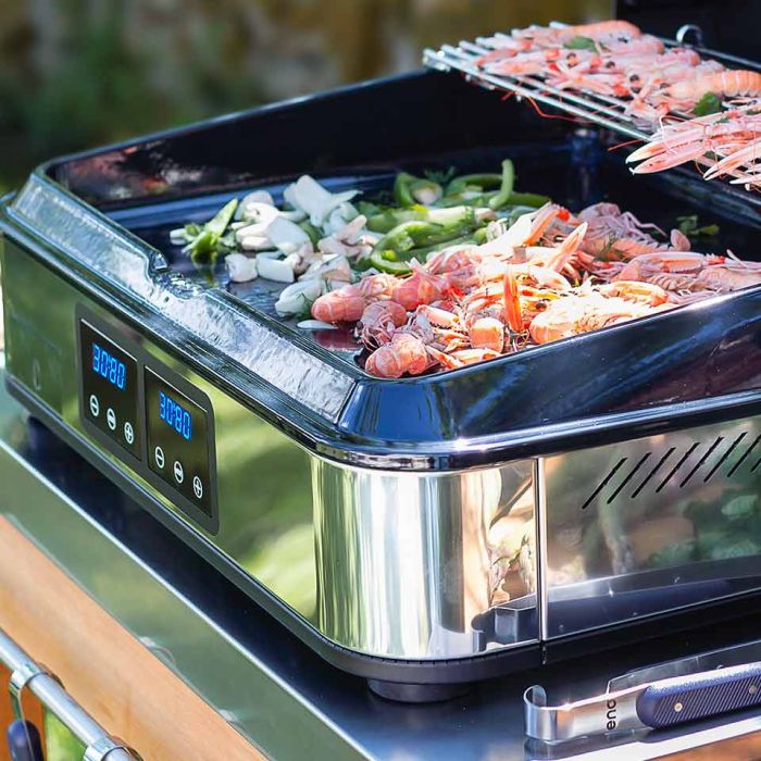 De elektrische plancha van Enosign is ideaal voor kleine ruimtes en kan eenvoudig op een werkblad binnenshuis of op een serveerwagen buitenshuis worden geplaatst. Het eigentijdse design met de perfecte aansluiting van de plaat en het frame maken het uniek. Eno heeft op basis van haar ervaring in de botensector gekozen voor het enige roestvrij staal van maritieme kwaliteit dat bestand is tegen zoutnevel voor het chassis. De Enosign plancha is ecologisch ontworpen en bespaart 20% energie dankzij de dubbele wand van de plaat en het frame en de zeer efficiënte stralingsbrander . De warmte wordt zo vastgehouden zonder dat er energie verloren gaat.