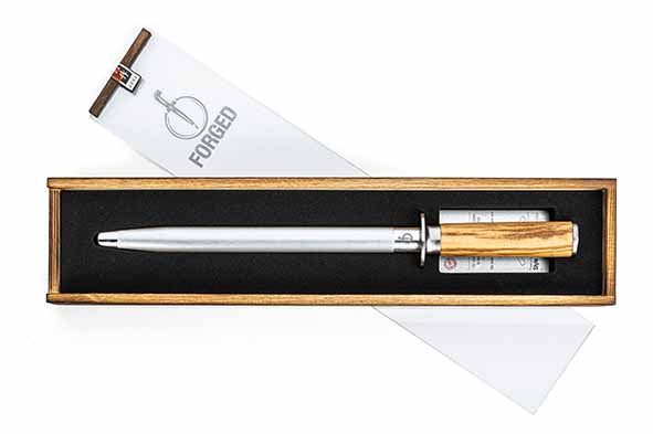 Dankzij het hoogwaardige staal kun je je messen eenvoudig en effectief aanzetten, zodat de snede mooi recht en scherp blijft. Het ergonomische handvat van olijfhout zorgt niet alleen voor een comfortabele grip, maar geeft het aanzetstaal ook die kenmerkende Forged-uitstraling: robuust, stijlvol en puur.