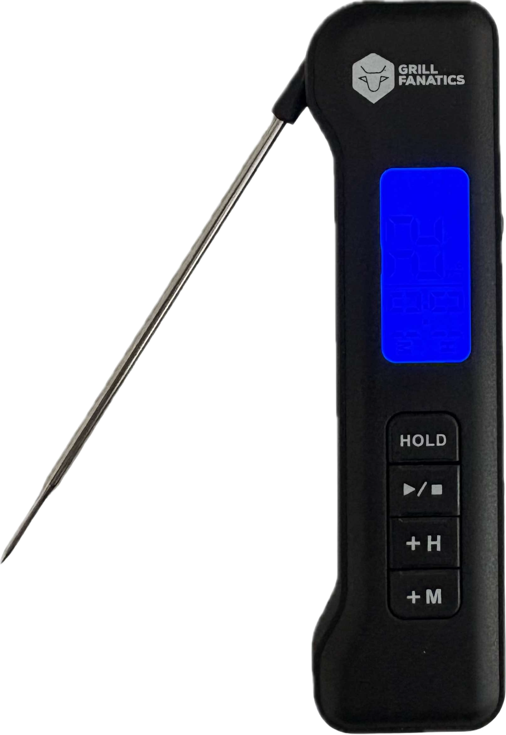 Met de Grill Fanatics Digitale thermometer meet je nauwkeurig de temperatuur van je vlees of vis. Het heldere LCD-scherm toont de temperatuur in °C of °F binnen enkele seconden. De inklapbare RVS-sonde maakt hem compact en handig in gebruik.