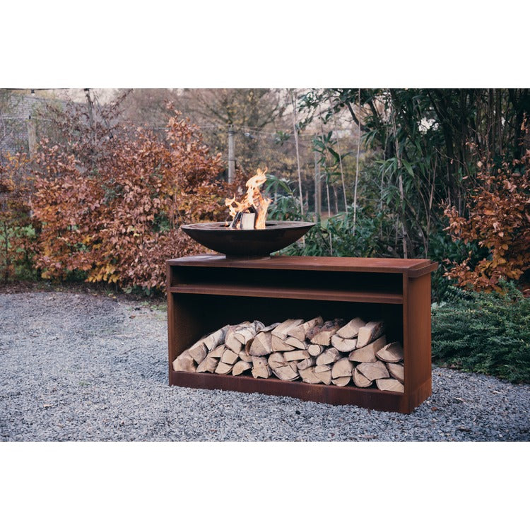 De Plancha work station met vuurschaal 80 cm kunnen dankzij de robuuste wielen eenvoudig verplaatst worden. Deze werktafel 150 cm met handvat is volledig uit cortenstaal vervaardigd en heeft bovenin een handig schapje om uw bbq-tools, kruiden, etc te bewaren.